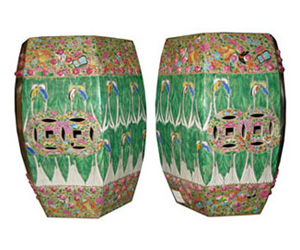 Shown in the Metropolitan Home room pictured above, these vintage Chinese garden seats are one unique find. The hand-painted porcelain is decorated with a design of cabbage leaves, and wide borders of flowers and butterflies.